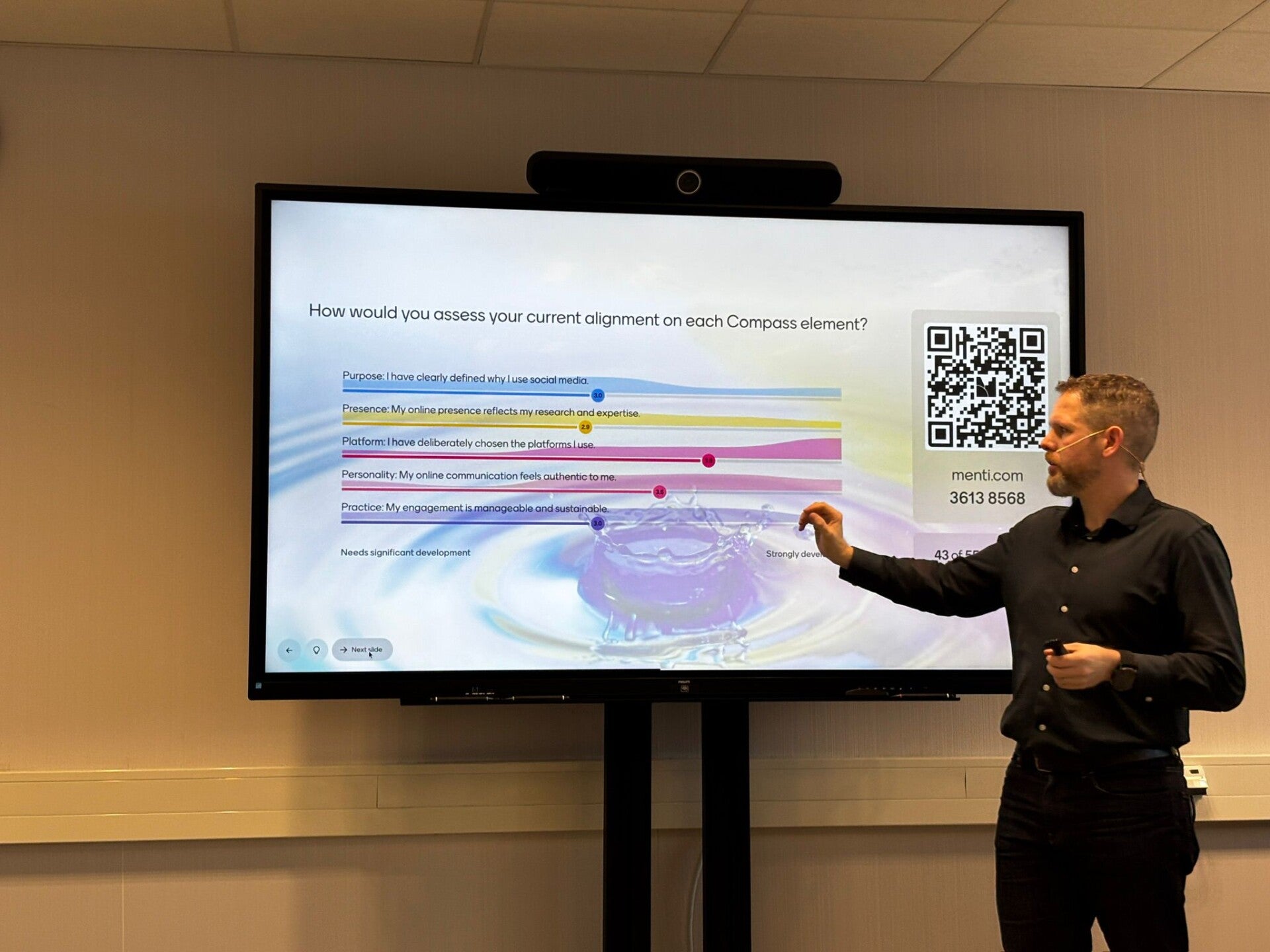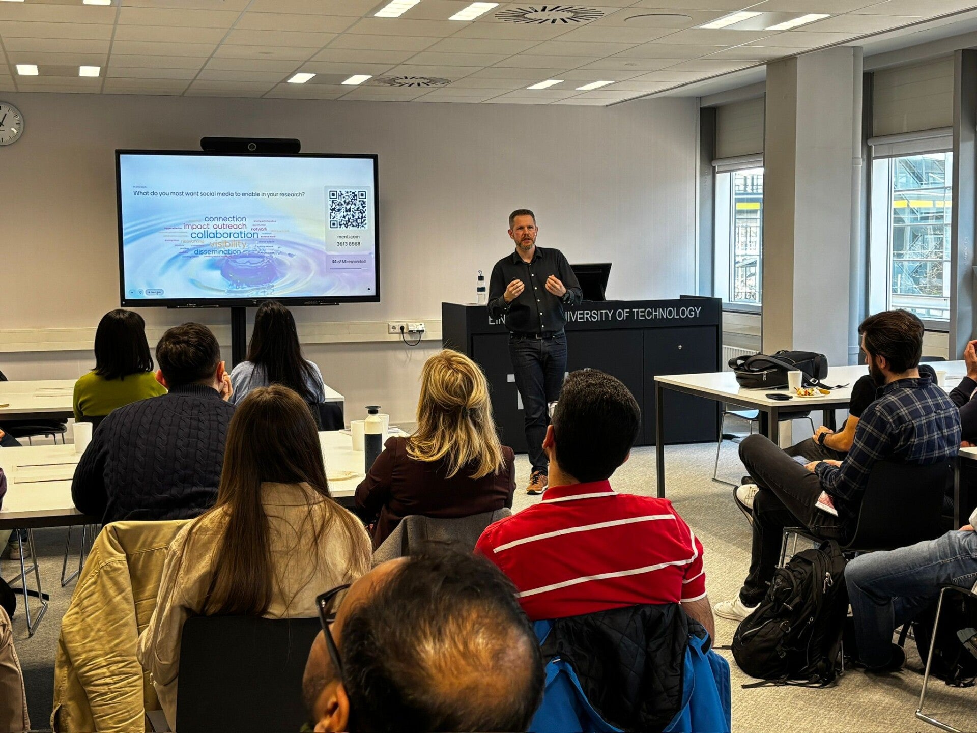 The TU/e session was a bit of an experiment. Rather than presenting and then opening the floor for questions at the end, I wove in a series of Mentimeter questions throughout — asking the audience to respond in real time to things like their main goal for using social media, how they assess their current online presence, where they feel least developed, and what they commit to doing in the next 30 days.