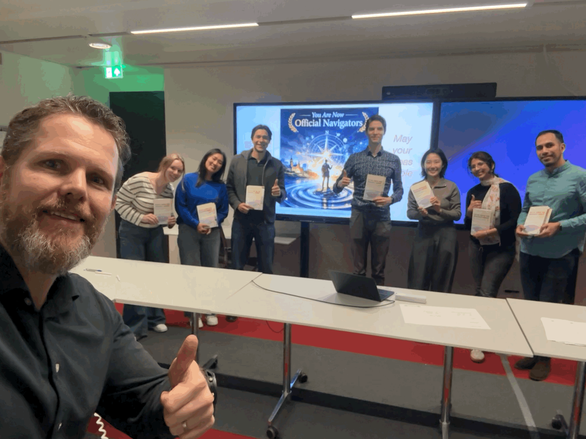 We then moved from the Compass to the Compass Craft Canvas, translating strategy into one concrete action per person: a post, a comment, a thread — something real and aligned with their own context. At the end, I officially declared them Social Media Navigators and handed each of them a copy of the book. Seeing them hold it made me genuinely proud. The questions they asked were sharp and constructive — the kind that push you to refine the workshop itself, not just deliver it. PhD students have a particular way of cutting through abstraction: they want to know what this means for their research, their field, their stage of career, and that specificity makes the conversation far more useful than any generic audience. And they gave me a beautiful pen engraved with "ITEM, TU/e" — I promised, half joking and half serious, to write the second edition with it.